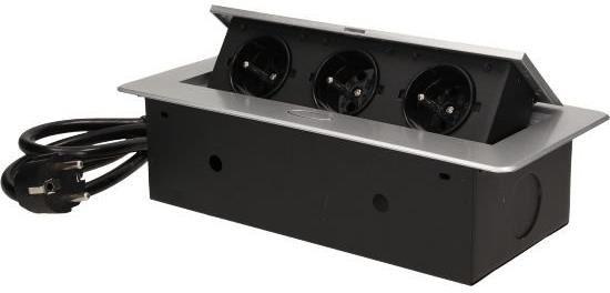Három darab 2P+Z elektromos aljzatból álló készlet kihúzható felső fedélben. Beltéri beépítésre tervezték asztalokba, asztallapokba és íróasztalokba, függőleges és vízszintes helyzetben egyaránt, hozzáférést biztosítva az elektromos csatlakozóaljzatokhoz Általános információk: ModellMagasság: 64 mmÖsszecsukható: IgenFiókszabvány: francia (E típus)Maximális ter