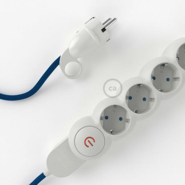 A műselyemkék RM12 Creative-Cables szövettel borított elektromos kábellel ellátott elosztó nem az Ön szokásos többszörös aljzata! A 4 Schuko/10A aljzat átlósan van elhelyezve, hogy optimalizálja a transzformátorok által elfoglalt helyet. A nagy keresztmetszetű kábel (1,5 mm2) 100%-ban Olaszországban készült. A schuko dugó kényelmes gyűrűvel van ellátva, amely nagyon megk