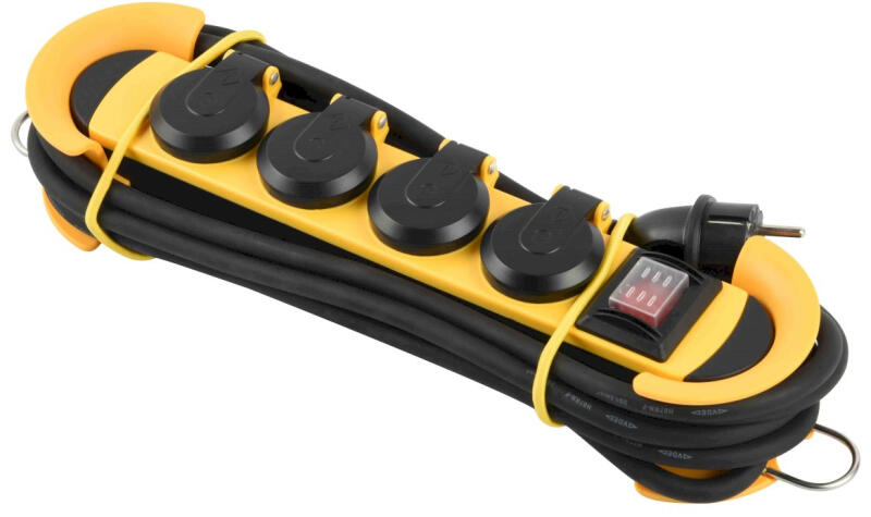 4 dugaljzattal 5 méteres gumi kábel kapcsolóval praktikus acél akasztó kampóval törésgátlóval, mely megakadályozza a vezető erek idő előtti törését 4-es fokozatú fröccsenő víz elleni védelem, IP44-es védettségű csatlakozó dugók használata esetén* tartósság és ütésállóság az alkalmazott polikarbonátnak köszönhetően védőérintkezővel ellátott Termékkód