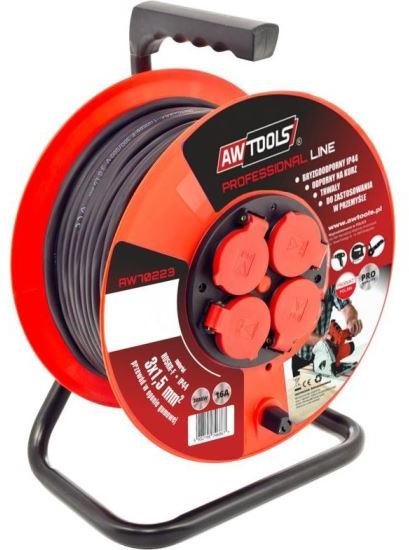 Kábel gumi burkolatban. Fém keret dobzárral és fogantyúval. A dob tartós műanyagból készült. 4 forgatható aljzat, földelt biztonsági burkolattal (IP44). Túlterhelés elleni védőkapcsoló és tekercselő fogantyú a könnyű feltekeréshez. Tökéletes az összes elektromos szerszámmal való munkához a műhelyben. Lengyelországban készült. Műszaki adatok: Típus: PROFESSIONAL