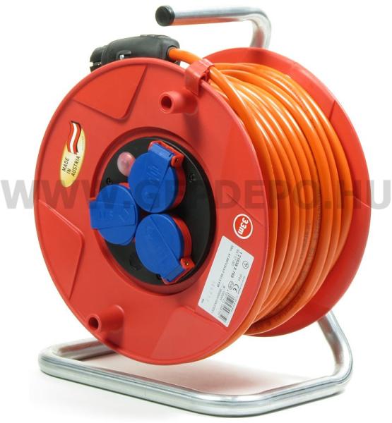 3x1,5mm-es 25 méter hosszú hálózati kábel kábeldobon. IP44-es besorolás, fokozottan cseppálló