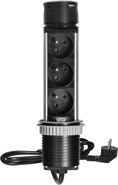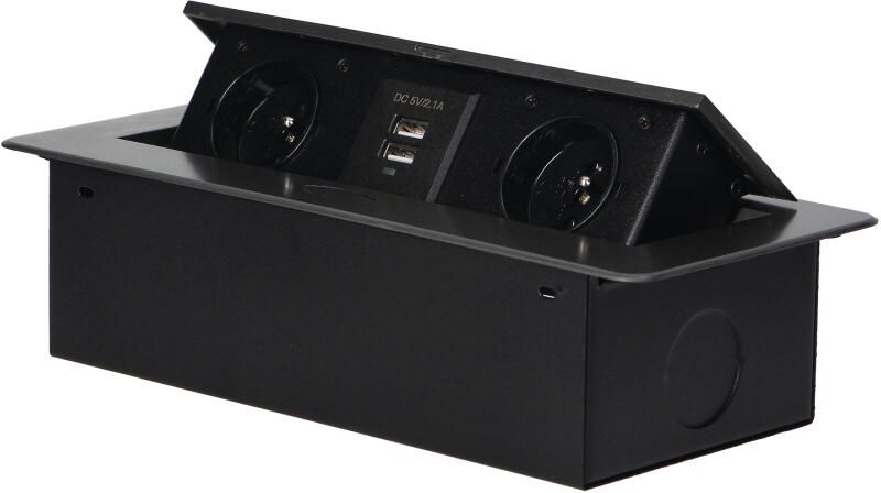 Két hálózati aljzatból álló készlet földeléssel és áramvédelemmel, két USB-töltővel kombinálva. A készlet egy olyan tokba van beépítve, amely íróasztalokba, munkalapokba és asztalokba integrálható. Függőlegesen és vízszintesen is felszerelhető, kényelmes hozzáférést biztosítva az elektromos csatlakozóaljzatokhoz. A lapos élnek (mindössze 2 mm) köszönhetően a