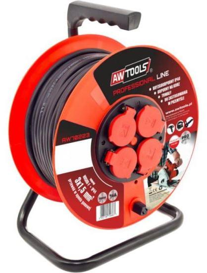 Kábel gumi burkolatban. Fém keret dobzárral és fogantyúval. A dob tartós műanyagból készült. 4 forgatható aljzat, földelt biztonsági burkolattal (IP44). Túlterhelés elleni védőkapcsoló és tekercselő fogantyú a könnyű feltekeréshez. Tökéletes az összes elektromos szerszámmal való munkához a műhelyben. Lengyelországban készült. Műszaki adatok: Szín: fekete Kábel: