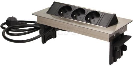 Fő jellemzőkHárom darab 2P+Z hálózati aljzatból álló készlet nikkelezett házban, visszahúzható felső résszel. A készüléket munkapadokba, munkalapokba és asztalokba történő beépítésre tervezték. Szabványos aljzat:(E típus) Vezeték nélküli töltési teljesítmény:0W Vezetékhossz:1,50 mMűszaki specifikációÁltalános információkModell:Beépítettmagasság : Beép