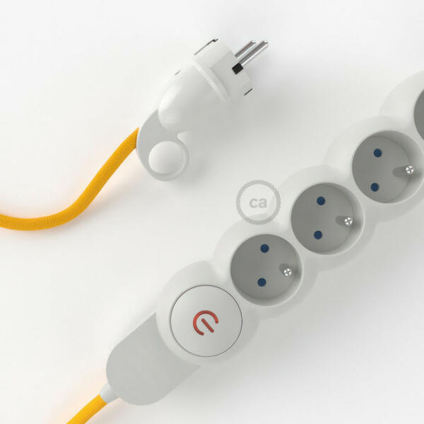 A műselyembevonatú elektromos kábellel ellátott elosztó, az RM10 Creative-Cables sárga szövet nem a szokásos többszörös aljzat! A 4 Schuko/10A aljzat átlósan, sorrendben van elhelyezve. hogy optimalizáljuk a transzformátorok által elfoglalt helyet. A nagy keresztmetszetű kábel (1,5 mm2) 100%-ban Olaszországban készült. A schuko dugó kényelmes gyűrűvel van ellátva, amely n