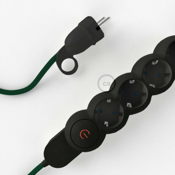 A műselyem Sötétzöld RM21 Creative-Cables szövettel borított elektromos kábellel ellátott elosztó nem az Ön szokásos többszörös aljzata! A 4 Schuko/10A aljzat átlósan van elhelyezve, hogy optimalizálja a transzformátorok által elfoglalt helyet. A nagy keresztmetszetű kábel (1,5 mm2) 100%-ban Olaszországban készült. A schuko dugó kényelmes gyűrűvel van ellátva, amely na