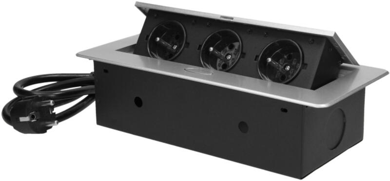 Három darab, földeléssel és áramvédelemmel ellátott hálózati aljzatkészlet 2500 W maximális névleges teljesítménnyel. Ezek az aljzatok kihúzható fedélben vannak elhelyezve. A készüléket íróasztalokba, munkalapokba és asztalokba történő beépítésre tervezték. Nagyon lapos és maratott peremével a panel elegánsan mutat bármely asztallapon, és nem nehezíti a tisztít