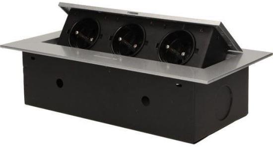 Három darab 2P+Z elektromos aljzatból álló készlet kihúzható felső fedélben. Asztalokba, asztallapokba és íróasztalokba történő belső beépítésre tervezve, függőleges és vízszintes helyzetben egyaránt, hozzáférést biztosítva az elektromos aljzatokhoz. Műszaki leírás Általános információk: Modell magasság: 67 mm Összecsukható: Igen Fiókszabvány: francia (E tí