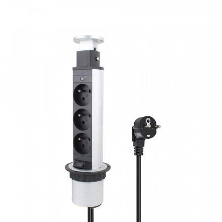 OMU system POP7 3F bútorba építhető, kihúzható rejtett elosztó, 3x2+F francia szabvány ezüst 220-240VAC 16A 1,8m kábelA bútorlapba építhető, előugró rejtewtt elosztók kiváló minőségű alumíniumból és műanyagból készülnek, biztonságosak és tartósak. Csavarhurokkal rendelkezik, amely könnyen felcsavarható a panel hátuljára. Az alja átcsúszik a munkalapon, majd va