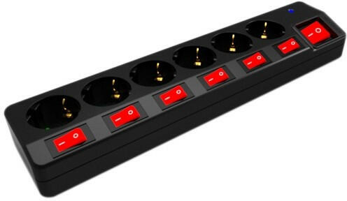 Elosztó világító kapcsolóval6 db földelt aljzatDerékszögű biztonsági csatlakozóAljzatok 45°-os elrendezésbenMaximum 3500W kapcsolási teljesítménnyel 16A maximális áramerősség mellett