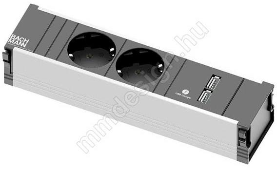 A bachmann Coni névre hallgató beépíthető konnektor magas minőségű és igazán elegáns megjelenésű. Masszív fém kerettel rendelkezik és a sörtézett kábelkivezető rész miatt lehajtott állapotban is tudjuk használni. 3 részből áll, fém keret (911.004), alsó burkolat és elosztó (912.0156). Az elosztó 2db euro dugaljal valamint 2db USB töltővel rendelkezik. Használhatju
