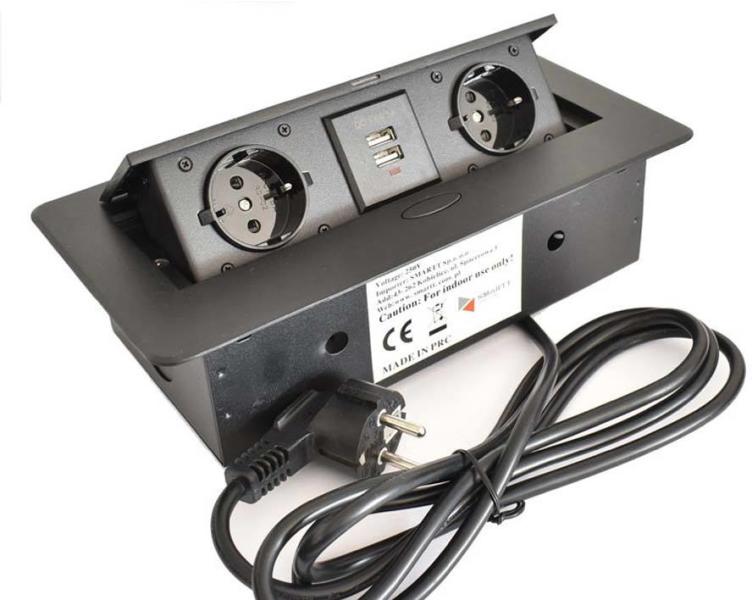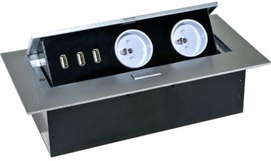 Két darab 2P+Z aljzatból álló készlet három USB-porttal (tápegység nélkül), visszahúzható felső fedélben. Íróasztalokba, asztallapokba és asztalokba történő beltéri telepítésre tervezték függőleges és vízszintes helyzetben egyaránt, miközben hozzáférést biztosít a konnektorokhoz. Műszaki leírás Általános információk: Modell magasság: 67 mm Összecsukható: