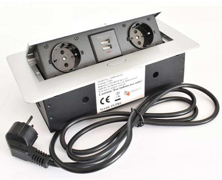 2x220V + 2xUSB töltőBeépítési méret: 225x110x65mm Vezetékkel és dugvillával. Anyaga: FémSzín: AlumíniumFeszültség: 230V / 50HzMax. teljesítmény: 3600WUSB töltő: 5V / 2,1A