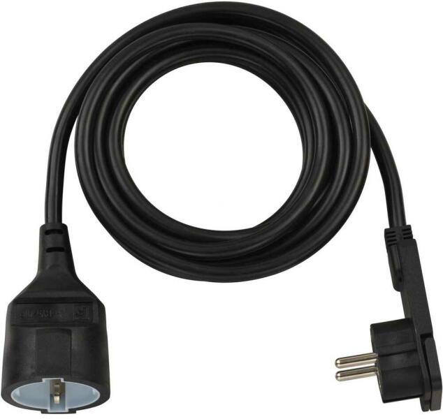 Műanyag hosszabbítókábel laposérintkezős dugóval, 3 m, fekete Műszaki adatok: Alkalmazási terület: Beltér · Csatlakozó típus A (illetve bemenetek): Védőérintkezős laposér dugó · Csatlakozó típus B (illetve kimenetek): Védőérintkezős alj · Dugaljak száma: 1 · Dugó kivitel: egyoldalt hajlított · Kábel kivitel: Áram Hosszabbítókábel · Kábel típus DIN/VDE szeri