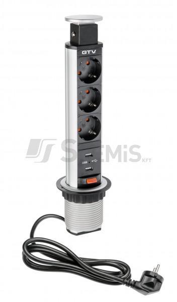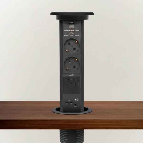 Motoros rejtett elosztó - bluetooth-os, ezüst 2 x 250 V + 2 x USB + AUX Motorosan süllyeszthető rejtett elosztó irodai és otthoni felhasználásra, fém házzal, 2 db gyermekvédelemmel ellátott hálózati aljzattal, dupla USB töltőegységgel, hangszóróval és bluetooth csatlakozási lehetőséggel. Hallgasson zenét például a konyhában vagy irodában az asztalába épített hálóza