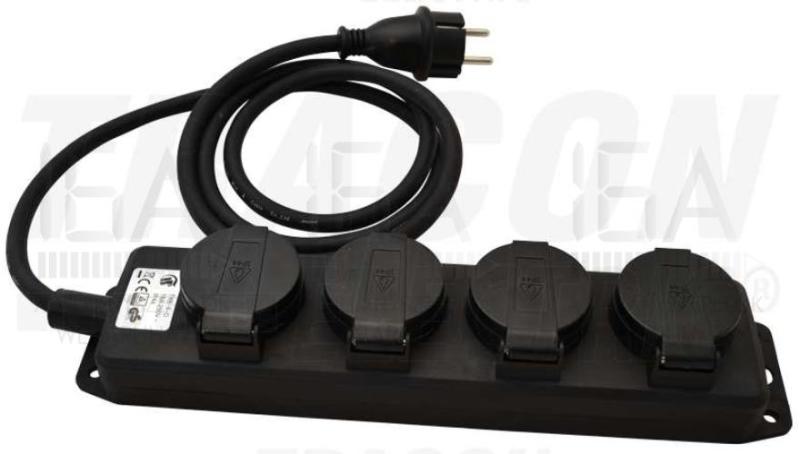 Tracon KE4-3M, Kültéri eloszósáv, fekete 16A/250VAC, IP44, H07RN-F, 3G1.5, 3m, 4×SCHUKO SCHUKO csatlakozók száma: 4 BE-/KI-kapcsolóval: Nem Túlfeszültség elleni védelem: Nem Névleges áram: 16 A Érkeresztmetszet: 1,5 mm2 Fedéllel: Igen Anyag: műanyag Szín: fekete Védettség: IP44 Tápvezeték hossza: 3 m Elfordított központi beépítés: Nem Elforgatott központi betét szöge: