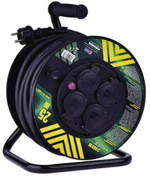 Kültéri használatra is alkalmas gumis kábeldob. 4 db földelt dugaszolóaljzattal a hálózati aljzatok gyermekvédelemmel vannak ellátva kábel típusa: H05RR-F 3G 1,5 mm2 keresztmetszetű gumivezeték kábel hossza: 25m teljesítmény: feltekert állapotban: 1100W / 230V~ 4,8A letekert állapotban: 3200W / 230V~ 13,9A túlterhelés elleni védelemmel ellátva IP44 kültéri kábeldob 4 véd