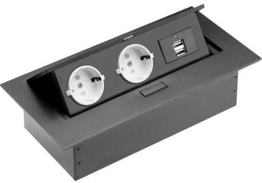 GTV rejtett elosztó: 2 darab 230 Voltos Schuko aljzat és 2 darab 5 Voltos USB csatlakozó található rajta. Bútorlapba, konyhabútorba, pultba, munkaasztalba süllyeszthető hálózati elosztó, földelt konnektorokkal. Kis helyet foglal, praktikus, elegáns. Gombbal nyitható: könnyen nyitható a fedlapon található gomb segítségével. Használaton kívül csak a téglalap alakú, fekete