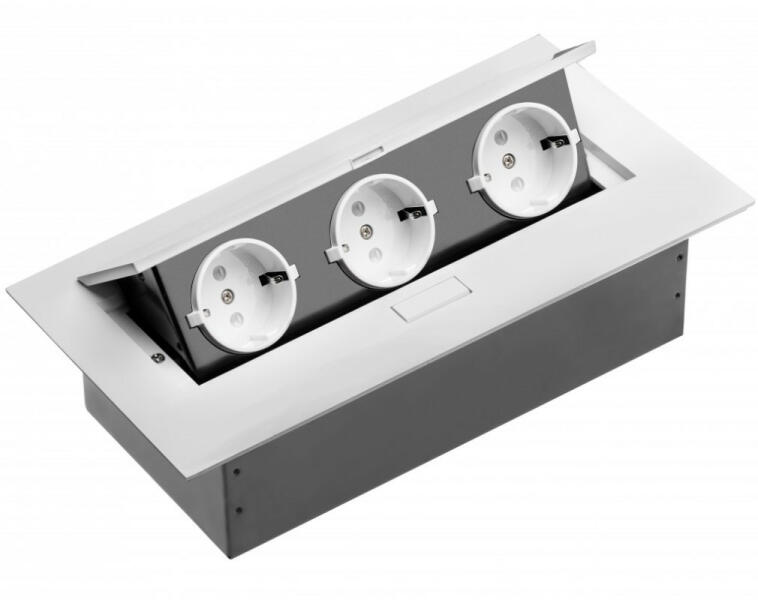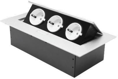 Asztalba süllyeszthető elosztó, 3db dugalj. Megnyomva a felületét kiemelkedik az asztalból. Feszültség: 250V Áramerősség: 16A Szín: Alumínium Védettség:IP20 Szabvány: DIN VDE 0620-1:2005, EN61242 Névleges teljesítmény: 2500W Vezeték nélkül Beépítési méret: 225x110mm mélysége: 66mm Takaró lap mérete: 266x130x3mm Szabaduljon meg a zavaró kábelrengetegtől az irodájá