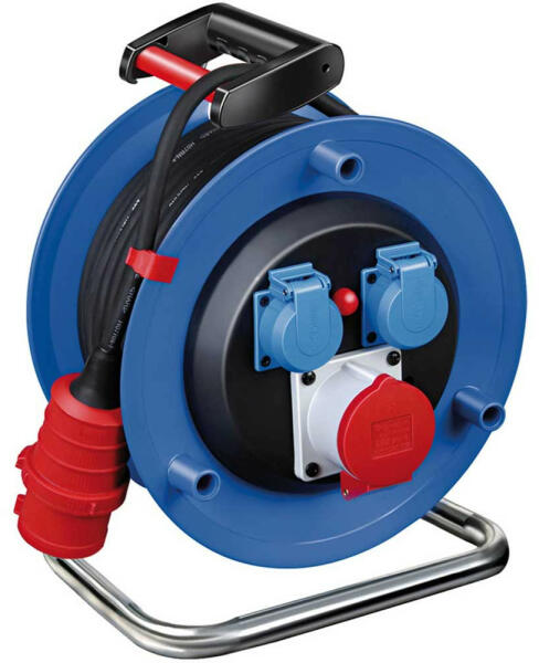 A dobtest különleges gumiból készül, és horganyzott állványra van rögzítve Ergonómiai szempontok szerint tervezett tengelyes fogantyú a tökéletes kábelmegvezetéshez a le- és a feltekercselés során 3-pólusú biztonsági lekapcsolással és túlhevülés elleni védelemmel 5-pólusú CEE-dugasszal 400 V/16 A 2 dugaszoló aljzat 230 V/16 A önzáró fedéllel, IP 44 védelem 1 CEE