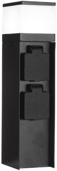 Kültéri 2-es elosztó oszlop, G9 foglalattal, fekete, IP44 Kerti energia oszlop, 2 db földelt csatlakozóaljzattal, önzáró fedelekkel. Csavaros rögzítési lehetőséggel. Ideális kerti eszközök, fűnyírók, vízművek biztonságos működtetéséhez. Az elosztó oszlop tartalmaz 1 darab G9-es foglalatot, amelynek köszönhetően kültéri világítás alakítható ki. A lámpa nem tart