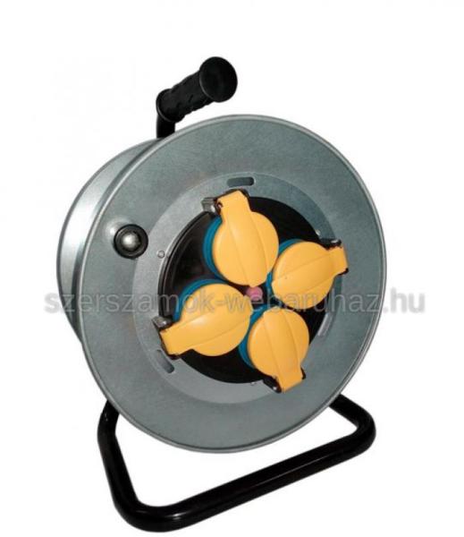 Z-TOOLS kábeldob fém, gumi szigetelt kábellel 25m 3x1,5 230V IP44 az iSzerszámnál. Z-TOOLS kábeldob fém, gumi szigetelt kábellel 25m 3x1,5 230V IP44. Csatlakozó: 250V, 16A. Aljzatok: Csapfedeles 4 db védőérintkezős 250V, 16A. Max. áramerősség: 16A. Névleges feszültség: 230V AC, 50Hz. Terhelés: 1100W/3200W (fel/letekerve). Vezeték típus: H05RR-F3G1,5mm2 gumi szigetelésű káb