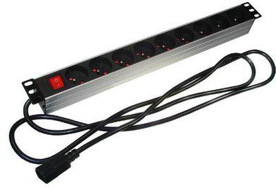 The PDU with 9 slots, 250V Cabinet 19 "with plug type C14 the company DIGITUS - 9-socket power strip with a solid aluminum profiles for mounting in 19 "(the ability to install different angles) - Strip has a backlit, central switch, plug type C14 (3-pole 10 A frequently used in computer power supplies, emergency power supplies UPS devices and rack-mount ICT), power cable 2m - Comes with terminal i