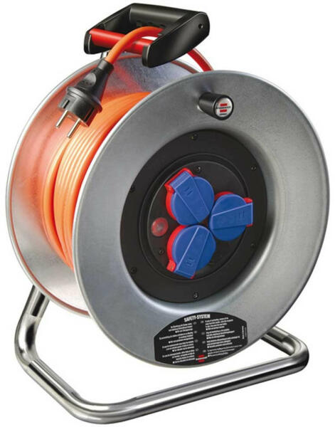Acéllemezből készült dobtest, rozsdavédelem céljából horganyozva, különösen stabil állványonErgonómiai szempontok szerint tervezett tengelyes fogantyú a tökéletes kábelmegvezetéshez a le- és a feltekercselés soránTúlhevülés elleni védelem, ellenőrző lámpa túlhevülés vagy túlterhelés eseténGumidugasz, 3 dugaszoló aljzat önzáró fedéllel