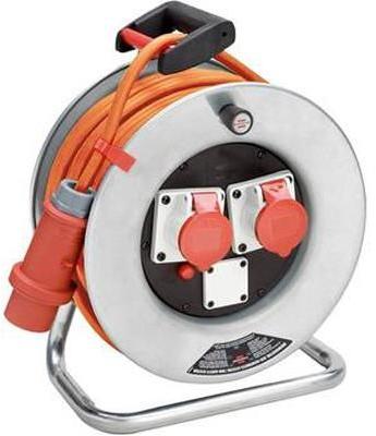 Brobusta® CEE 2 IP 44 ipari/építkezési kábeldob kocsival. Építőipari területen történő és tartós kültéri használatra, IP 44. CEE-változat, fröccsenővíz ellen védett. Acéllemezből készült dobtest, rozsdavédelem céljából horganyozva, különösen stabil állványon. . CEE 5-pólusú dugasz, 400 V/16 A, fázisfordító. 1 dugaszoló aljzat 230 V, önzáró fedéllel, IP