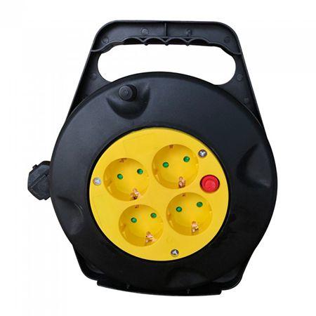 Kábeldob, hálózati hosszabbító 4 földelt konnektorral A fekete, strapabíró műanyag házban 1,5mm2 keresztmetszetű, 3 eres, 10m-es, PVC szigeteléssel ellátott sodrott réz vezeték található feltekerve. A házon kialakított fogantyúval egyszerűen mozgatható. Az MT (vagy H05VV-F) kábel feltekerése gyorsan, könnyen megy a forgó markolat használatával. Terhelhetősége max 16A,