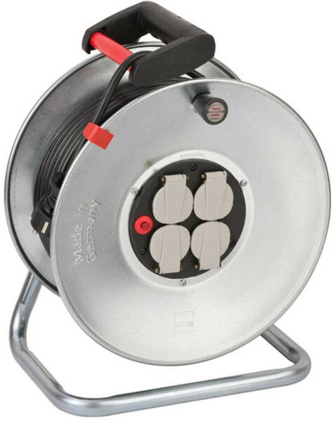 Terméktulajdonságok: Acéllemezből készült dobtest, rozsdavédelem céljából horganyozva, különösen stabil állványon. . Ergonómiai szempontok szerint tervezett tengelyes fogantyú a tökéletes kábelmegvezetéshez a le- és a feltekercselés során. Túlhevülés elleni védelem, ellenőrző lámpa túlhevülés vagy túlterhelés esetén. Dugasz, 4 csapófedeles dugaszoló aljzat. K