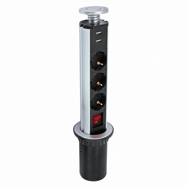 Bútorba építhető elosztó 3x 16A 250 V~ 3500 W, 2x USB 5V 2.1 A, kapcsolóval Praktikus megoldás a konyhában vagy az irodában a villamos energiához való csatlakozáshoz. A felugró aljzatok az asztallal egy síkban vannak felszerelve, és használat közben helyet takarítanak meg az elegáns függőleges kialakításnak köszönhetően. Bútorba építhető elosztó 3x 16A 250 V~ 3500 W,