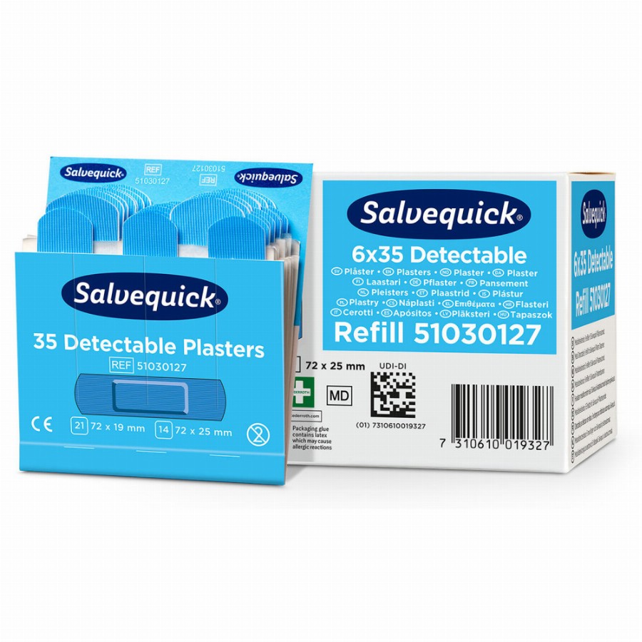 Termék részletekPrémium minőségű Salvequick kék detektálható sebtapasz utántöltő készlet kifejezetten az élelmiszer ipar számára kifejlesztve. Az élelmiszeriparban alkalmazott legtöbb detektor érzékeli. A kék színnek köszönhetően a tapaszok könnyen észrevehetők. Bőrgyógyászatilag tesztelt. Könnyedén egy kézzel felhelyezhetőek, puhák, rugalmasak és kényelmesen használhatók. 35