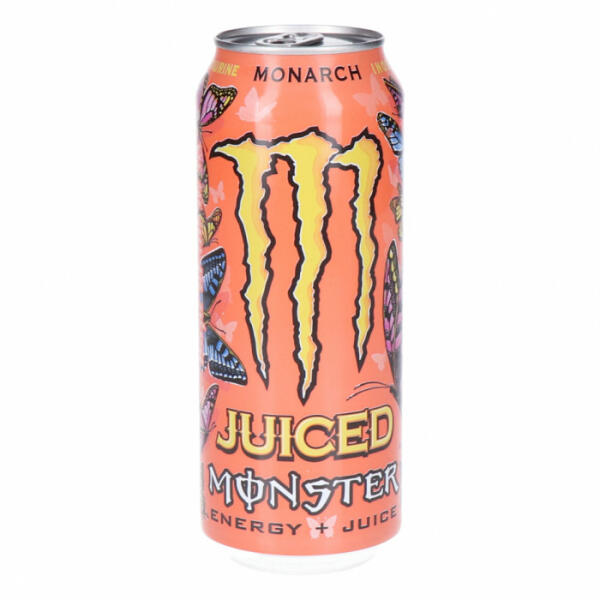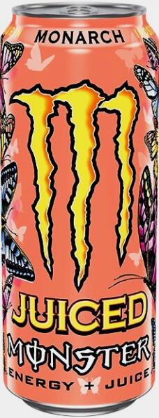 Monster Juiced energiaital Monarch 500ml Szénsavas energiaital, amely 5% gyümölcslevet tartalmaz koncentrátumból. Tartalmaz továbbá: Taurin, koffein, L-karnitin, inozitol és B-vitaminok. Cukorral és édesítőszerrel. Pasztőrözött. Hozzávalók: Víz, cukor. Gyümölcslevek koncentrátumokból: (5%) (alma, őszibarack, körte, ananász, nektarin, mangó, banán). Glükózszirup, Szén-