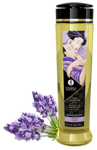 EROTIC MASSAGE OIL -LAVENDER, 240ml. Élvezze az érzéki erotikus masszázsok örömét ezzzel a többek között mandulaolajból, szőlőolajból, E-vitaminból, illóolajból, napraforgóolajból készített exkluzív keverékkel. hidegen sajtolt olaj keverékével, levendula illattal. Ezeket az olajokat gondosan választották ki stimuláló és energizáló tulajdonságaik miatt. 240ml.