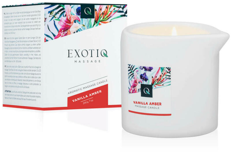 Exotiq Vanilla Amber - masszázsgyertya (200g) Érzéki masszázsgyertya, vanília és borostyán különleges illatkeverékével, melynek köszönhetően a relaxációs, vagy intimmasszázs közben igazán a Paradicsomban érezheted magad és vágyad is szárnyra kel! Prémium minőségű gyertya, mely a kanóc meggyújtását követően inspiráló, meleg, pihentető masszázsolajjá alakul. Mi