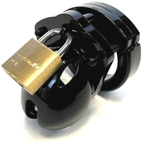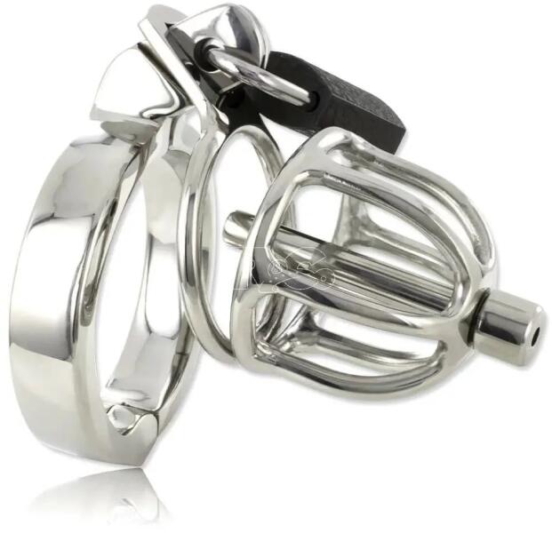 Rövid erényöv ketrec katéterrel. Acél erényöv férfiaknak. A makk résznél katéter helyezhető belé(tartozék, hossza:5cm, átmérő:0,6cm). A katéter végig üreges így pisiléshez se kell levenni. A heréhez kell csatlakoztatni a heregyűrűt majd lakattal fixálni. A lakat tartozék 2db. kulccsal. hossza:4cm, belső átmérő:3cm heregyűrű átmérő:4,5cm.