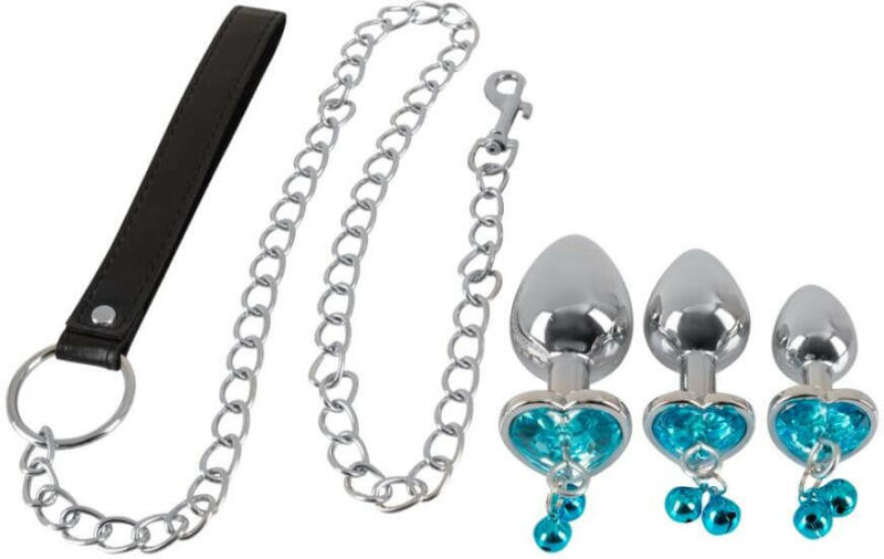 Butt Plug Set - anál dildó szett pórázzal (ezüst)Csengőkkel és pórázzal felszerelt análkúp tágító készlet, ami tökéletes anál tréninghez, a kezdőtől a haladóig, vagy extra kitöltő élményhez aktus közben, illetve anál tágításhoz egyaránt! A póráznak köszönhetően pedig könnyen kordában tarthatod kedvesed, hogy megnevelhesd a rossz kis cicád, mikor rossz fát