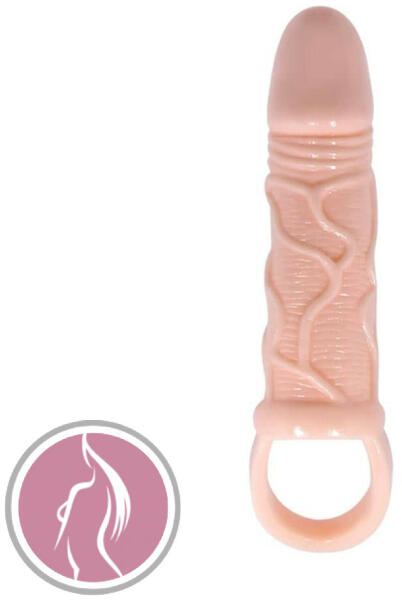 Vibrációs, rugalmas péniszhosszabbító köpeny Rugalmas és puha zselés anyagból készült, testszínű péniszhosszabbító köpeny, beépített vibrációval, mely funkció csak nyomóerő hatására lép működésbe. A formás makkos kialakítás és az erezett-bordázott felszíni textúra hatványozza a gyönyör érzését, és garantáltan a mennyekbe repíti kedvesedet, miközben az