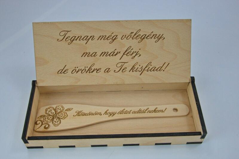 Szülő köszöntő ajándék fakanállal egy elegáns és emlékezetes ajándék, amely számos különleges alkalmakra ajánlott, mint például születésnap, névnap, esküvő, vagy éppen az édesanyák, nagymamák, vagy szeretteink köszöntésére. A doboz mérete 32 cm x 12 cm x 4 cm, és rétegelt lemezből készül, ami tartós és strapabíró anyag. A fa doboz és a fakanál gravírozo