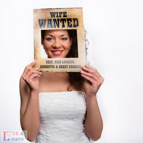 Vicces fotókellékek esküvőre, "Férjet keresek" és " feleséget keresek angol feliratos vicces fotó keret. Mérete: 32*24 cm Egy csomagban 2 db fotókeret van