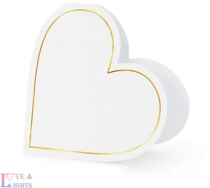 Szív alakú papír ültetőkártya esküvőre, rendezvényekre Szív alakú papír ültetőkártya arany színű szegéllyel, hátoldalán arany színű felirattal. Esküvőre, rendezvényekre szép dekoráció. Méret: 15,7*22 cm