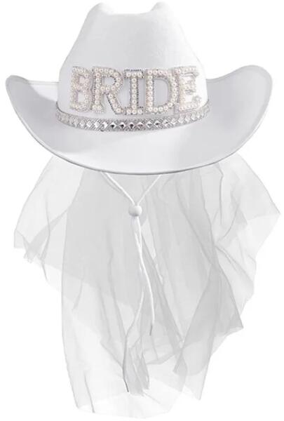 Kalap fátyollal - Bride A fehér menyasszonyikalap gyöngykövekkel díszített "BRIDE" felirattal és hozzátartozó fátyollal stílusos kiegészítő egy leánybúcsúhoz vagy esküvőhöz . A modern western megjelenést klasszikus esküvői vonásokkal ötvözi, kivételes és felejthetetlen stílust adva a menyasszonynak . mennyiség: 1 db anyag: poliészter méret: 38 x 13 x 30 cm