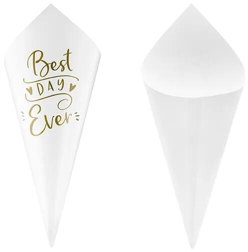 Papír tölcsér konfettihez - Best Day Ever Színesítse esküvőjét konfettihez való papír tölcsérekkel ! Ossza ki ezeket a tölcséreket a ceremónia alatt, a szertartás után vagy a táncparketten, és hagyja, hogy vendégei mosollyal az arcukon Önnel együtt ünnepeljék ezt a napot. mennyiség: 10 db/ 1 csomagban méret: 16 cm