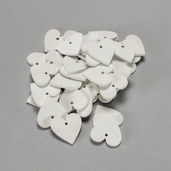 Fehér színű fa szívek, 2mm lyukkal. Méret: 3cm, vastagság:3mm
