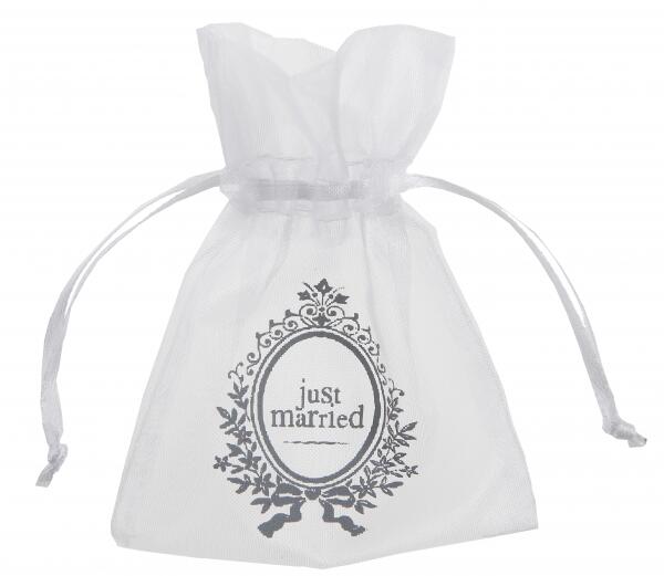 Organza tasak - Just married 10 db Lágy és elegáns organza tasak Just married felirattal alkalmas az esküvői vendégek apró ajandékainak elhelyezésére. Minden vendégnek örömet szerezhet ezzel a kedves figyelmességgel. méret : 7,5 x 10 cm mennyiség : 10 db / 1 csomagban szín : fehér