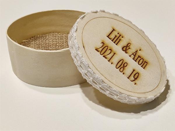Esküvői gyűrűtartó dobozka fából gravírozással. Méret: magasság 4 cm , szélesség 6x8 cm A megrendelés megjegyzésébe kérjük írja le a neveket és a dátumot.