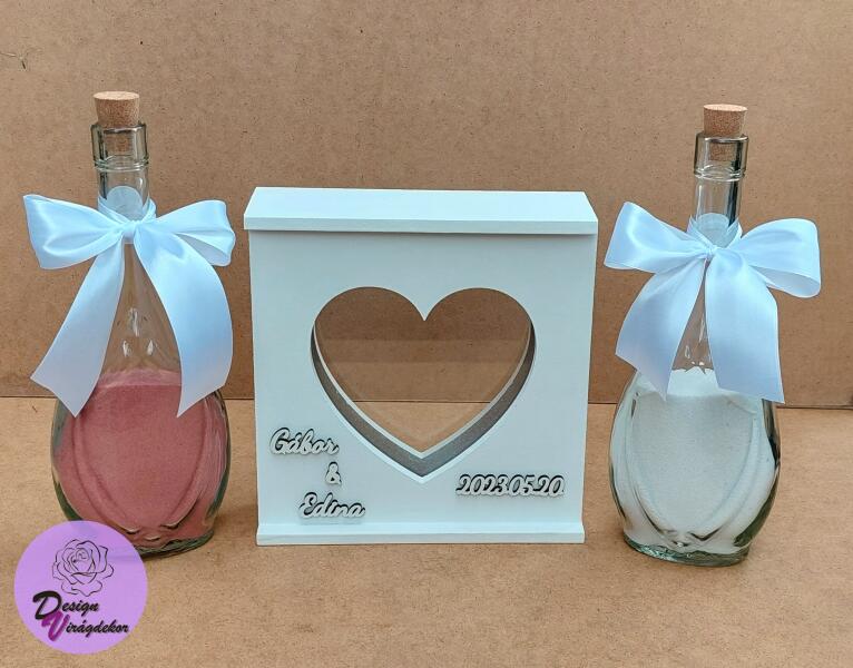 Homokceremónia szett Névre szóló Homoköntő, homokszóró szett, esküvői homok ceremóniához, választható színű homokkal. A szett tartalma: 1db öntődoboz, elől szív formájú kivágással, üveg borítással 2db üveg különböző (választható) színű homokkal (A képeken Fekete és Fehér színű homokkal töltve…) Az öntődoboz névvel, és dátummal feliratozható. A feli
