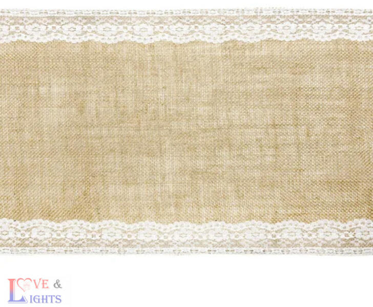 Juta asztali futó fehér csipke szegéllyel Jó választás vintage esküvői dekorációhoz Mérete: 0,28 x 2,75 m