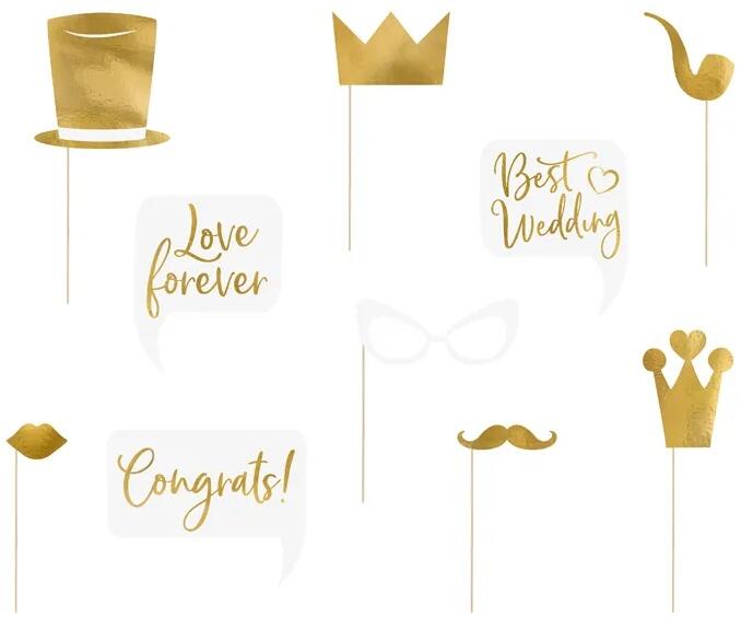 Esküvői fotó kellékek - arany - fehér Ezek a fényképes kellékek változatossá teszik esküvői fotóit. A kellékek fehér - arany színben vannak hangolva. mennyiség : 10 db